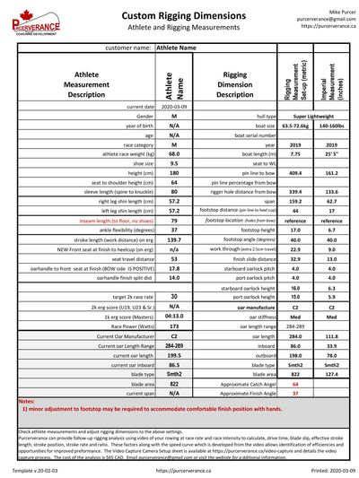 Receive your Custom Rigging Setup sheet identifying your boat's rigging dimensions. Also, receive a copy of Mike's RIGGING book (PDF) that outlines how and where rigging dimensions are measured. Finally, submit a video of your rowing, and receive a Purcerverance Rigging Analysis to evaluate the new rigging based on your rowing technique and power application. The analysis will identify any minor adjustments needed to improve your rigging efficiency.